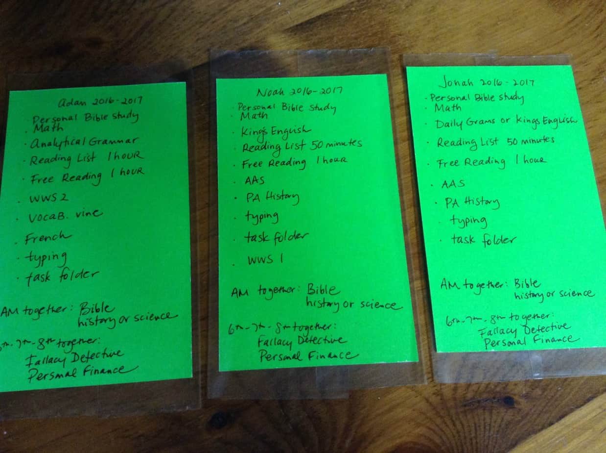 One final thing – I ask the boys each year if they want paper checklists, assignment notebooks, or laminated cards with their schedule, and they still seem to like the cards. (Edit: We like to use Trello now)
